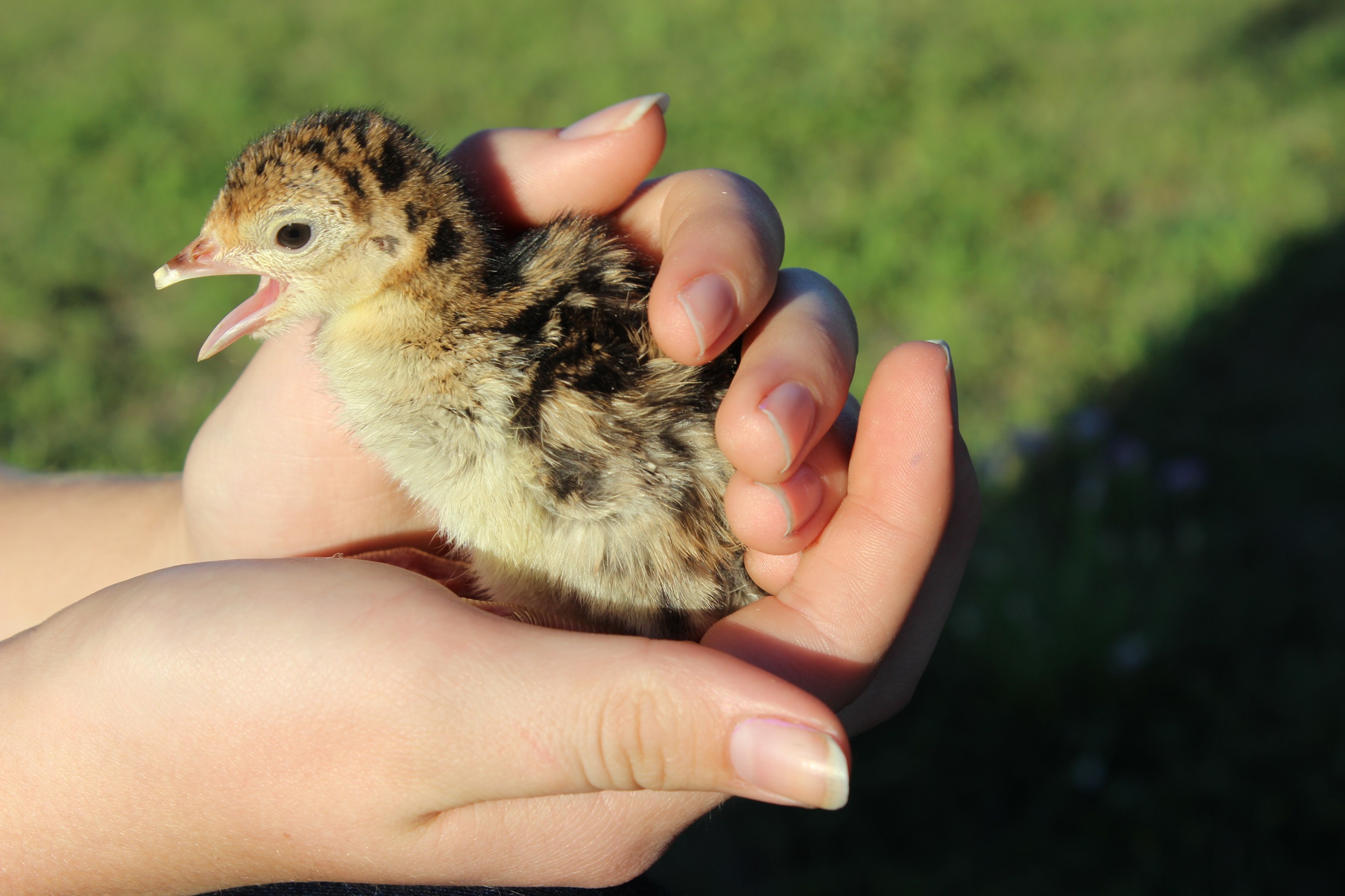 Our lady turkeys began laying eggs about a month ago and in hopes of producing baby turkeys the eggs were turned over to a pair of broody chickens. These chickens are insane. They puff their feathers out and tuck the eggs under themselves. Growl and bite if you get near them. They make me think of the game Angry Birds. You don’t mess with their eggs. Today all that hard work paid off in the form of a baby turkey poult staggering around the coop.